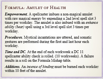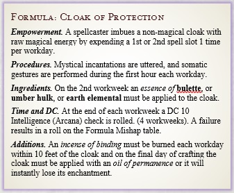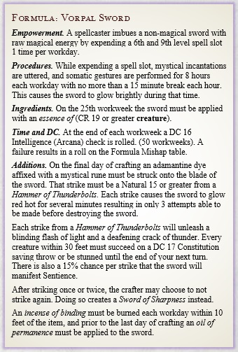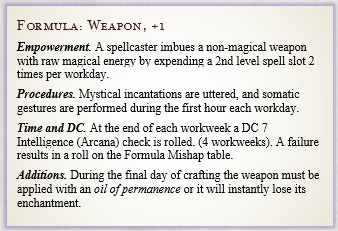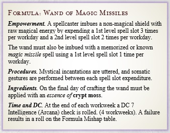 A crafter needs a formula for a magic item to create or the process becomes mostly research that may result in many failures and costly experiments. The formula is like a recipe for brewing potions and such, but it is more intricate and involves incorporating the Thread of the Weave and various exotic ingredients. Each formula lists the needed materials, spells, mystical incantations, and somatic gestures required to make it.